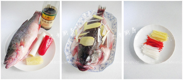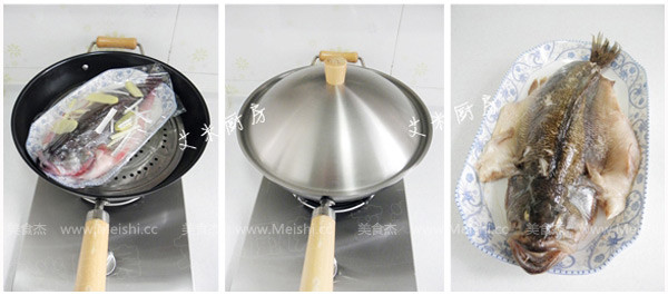 4.將蒸好的魚身上的蔥姜去除,倒掉蒸魚時(shí)滲出的汁水
