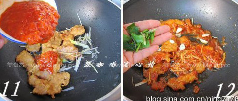 11.倒入之前做好的番茄醬汁快速炒勻,使每片肉都被醬汁包裹住,放雞精調(diào)味,再放入蒜片
