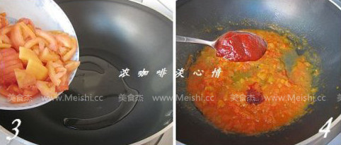 3.西紅柿放入滾水中燙軟,然后撕去外皮,切成薄片,炒鍋燒熱,倒入2大勺油,放入西紅柿片,用小火進(jìn)行翻炒,邊炒邊用鏟子將西紅柿片搗碎,直到西紅柿片變成醬汁為止