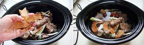 4.撈出豬小排沖洗干凈,放入慢燉鍋陶瓷內膽中,放入蔥段、姜片、八角、胡椒粉還有料酒