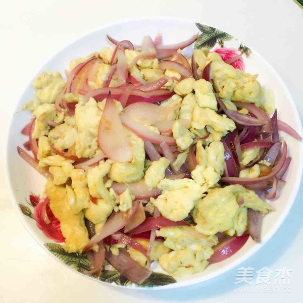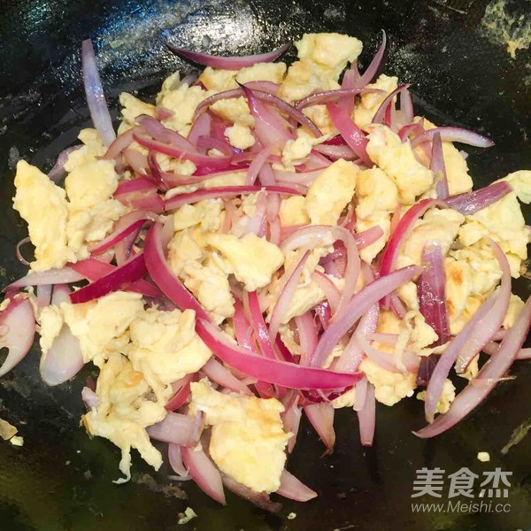 洋蔥稍微變色后倒入雞蛋,加鹽混合炒。