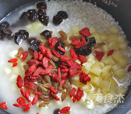 7.繼續放入蜜棗、葡萄干、枸杞。