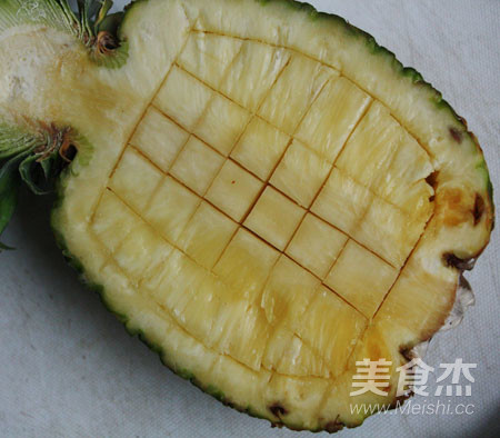 2.菠蘿半個,將表面切成小方塊,切時要深一點,但不要切到皮。