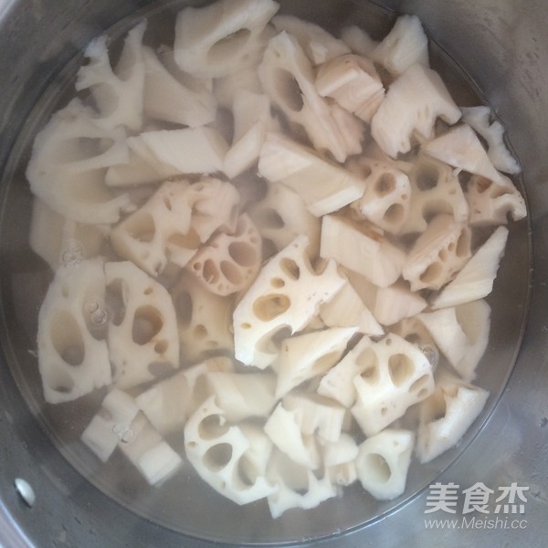 蓮藕開水焯燙3分鐘,撈出瀝去水分備用。