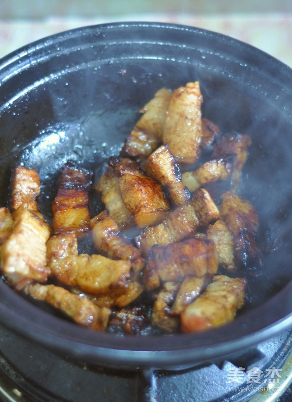 4.砂鍋里倒入油,放入冰糖,等糖融化后變色放入五花肉翻炒上色。