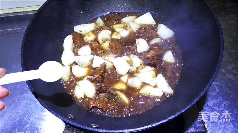 3、先把牛腩肉燉制8成熟后再下入山藥(或其他食材)一起燉,這樣2種食材的成熟度是一樣的。