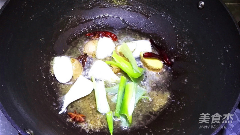 6.鍋中放油,將蔥、紅尖椒、姜片、八角入鍋煸炒;