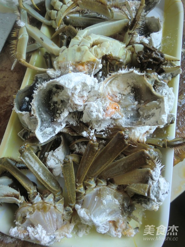 將蟹子洗凈去殼,身子切成二塊,刀口處沾上干粉備用