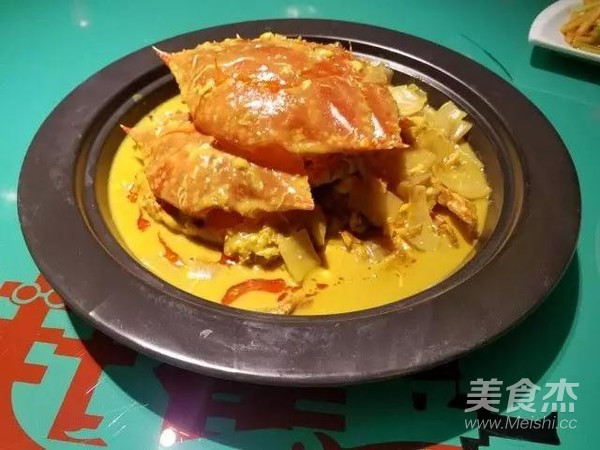 內留底油少許,加入洋蔥、姜片爆炒然后加入適量水、原味高湯調味料、咖喱醬調味料、三花淡奶、蟹塊一起燒開