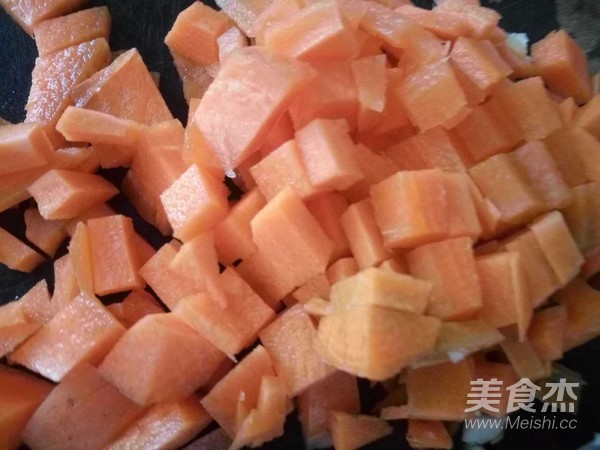 鍋熱油,下姜蒜炒香,加入紅蘿卜翻炒斷生。