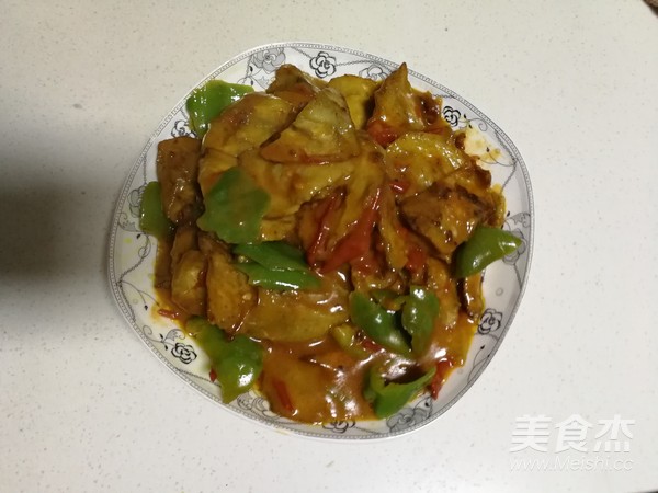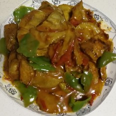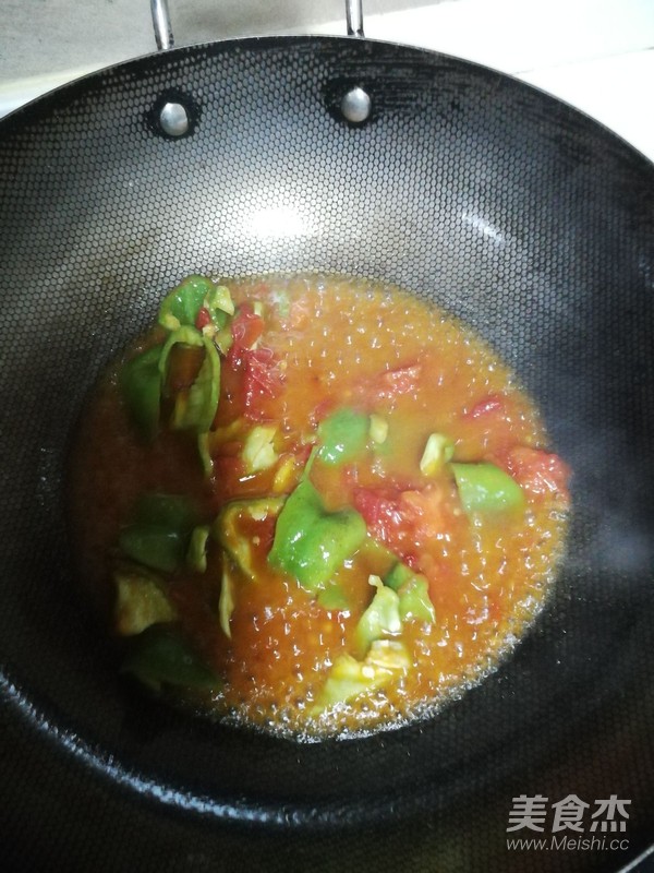 鍋里放少許油,加入西紅柿和青椒,加入適量鹽、花椒粉、生姜和淀粉,溝汁。