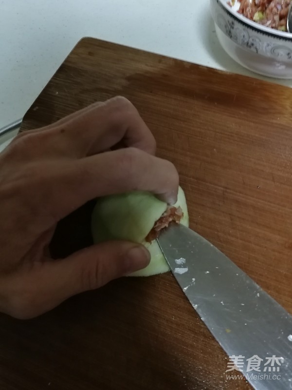 兩切塊的茄子開口,塞入腌制好的大肉。