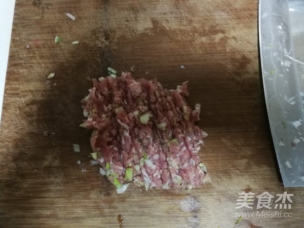 大肉和白蔥切丁,加入適量白糖、鹽、花椒粉、生姜粉和醬油,腌制2分鐘!
