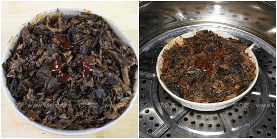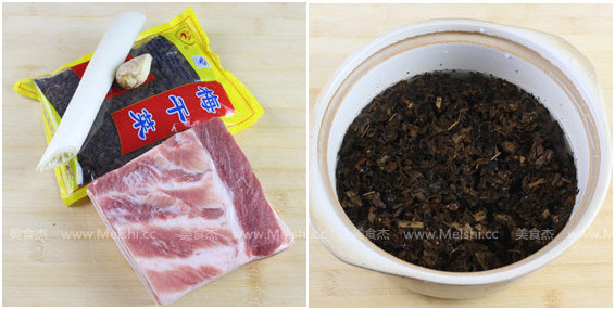 2. 梅菜用水泡上,洗兩次,把土和渣子洗一下,不用洗太干凈,不然味道跑了