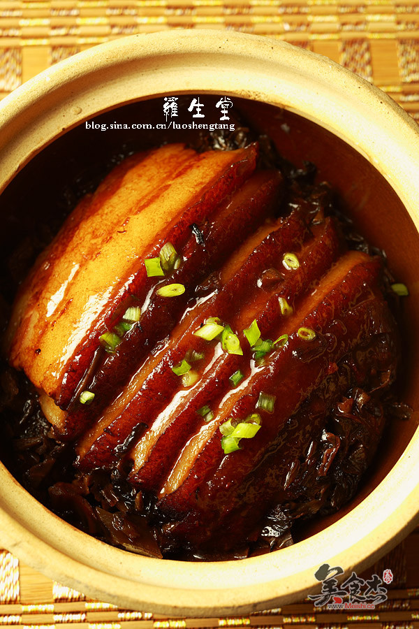 7.找一個碗,肉皮朝下碼好,然后把泡好的梅菜擠干水放在上邊弄整齊了,如果還有剩下的汁醬就全澆上去