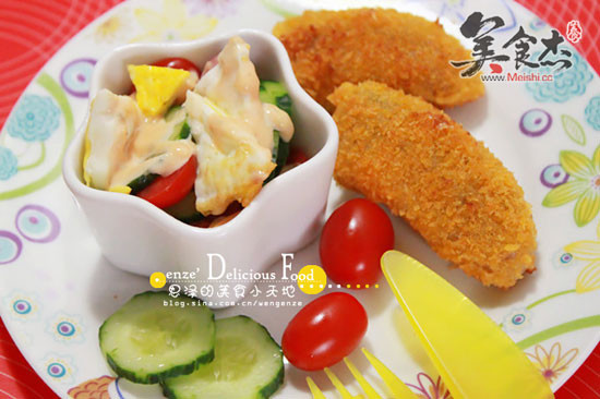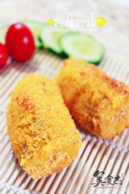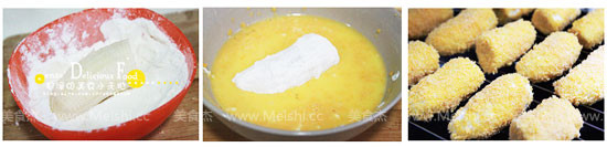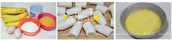 1.依次將香蕉沾上一層面粉、雞蛋煉乳液、面包糠