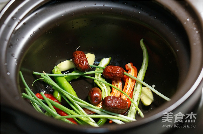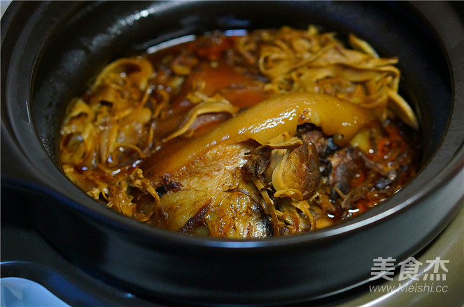 4.將焯好的蹄膀下鍋,再加入玉筍片。