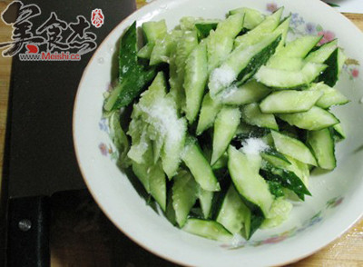 2.黃瓜切菱形,然后加鹽腌制10分鐘