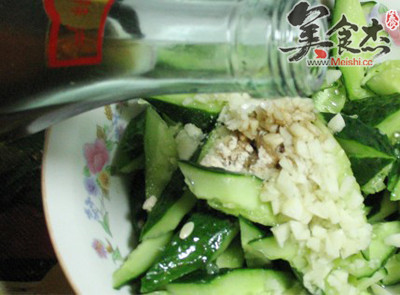 4.把蒜沫放入黃瓜中,倒入麻油,加點雞精拌勻一下
