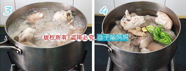 2.將焯過水的豬蹄重新放入鍋中,加入兩倍的清水,放入蔥、姜