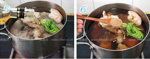 3.再往鍋中放入料酒、醬油、花椒、大料大火燒開轉(zhuǎn)小火燉2個小時