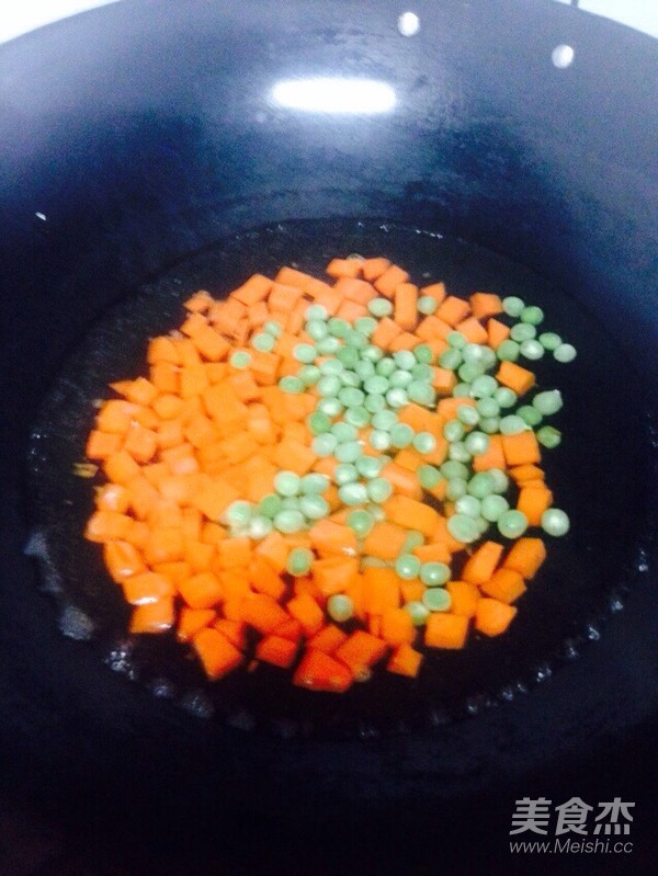 鍋里倒入適量的水,放入豌豆和胡蘿卜焯水,撈出瀝干水分備用