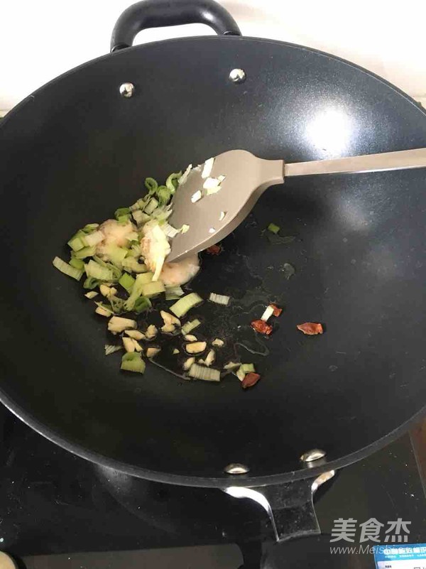 2.小火熱鍋 放入豬油適量(豆油代替也行不過豬油最佳)放入蔥蒜大料 三勺鹽十三香適量。