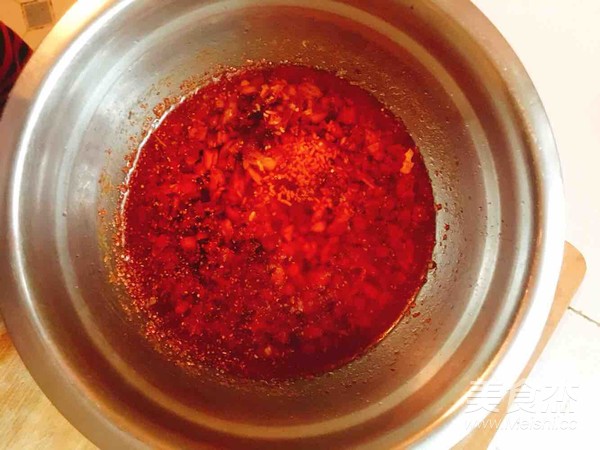 鍋中倒入油,放入花椒粒炸香后倒入碗中