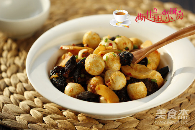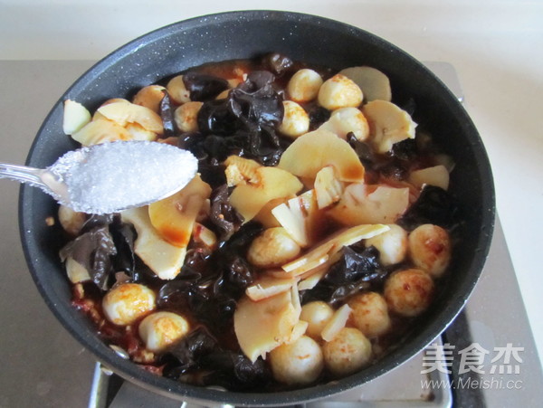 9.翻炒出紅油后放入鵪鶉蛋進去翻炒;