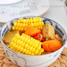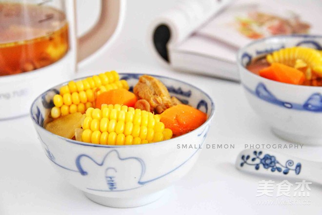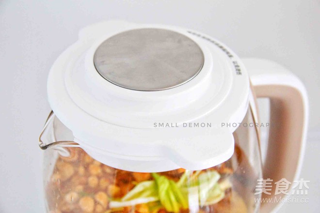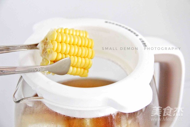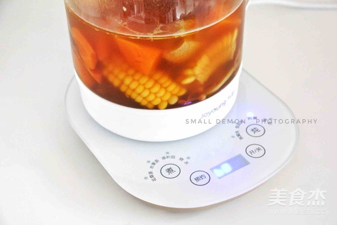 在工作還有半小時左右加入玉米和胡蘿卜,蓋上壺蓋,繼續工作。