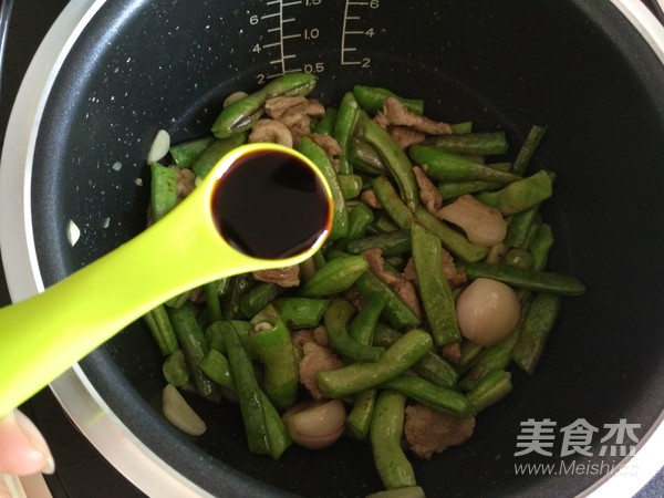 6.加入切好的豆角,翻炒至豆角顏色變色,再加入醬油和食鹽,翻炒均勻;