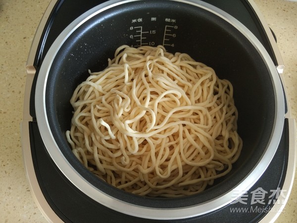8. 然后在上面放上手搟面,蓋上蓋子,15分鐘后把面條和下面的食材翻動(dòng)均勻;
