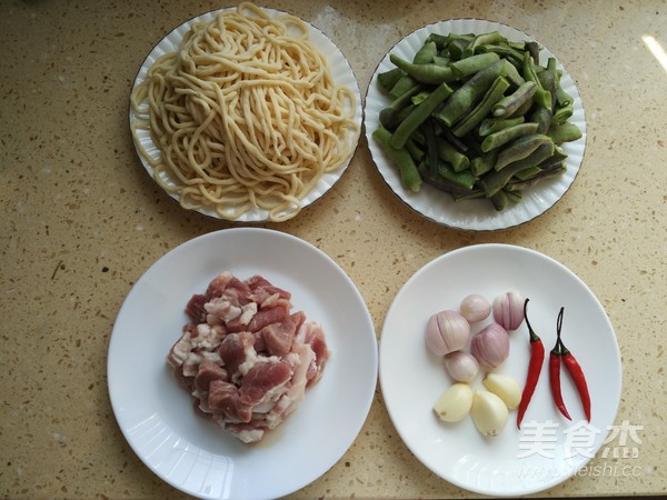 1.準(zhǔn)備好食材:手搟面500克,豆角300克,豬瘦肉150克,海米20克(忘記入鏡了),辣椒3個(gè),大蒜3瓣,紅蔥頭3個(gè);