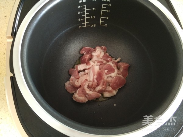 4.內(nèi)膽加熱之后,打開(kāi)鍋蓋,放適量食用油,再將豬瘦肉片放入鍋內(nèi),翻炒直至變色;
