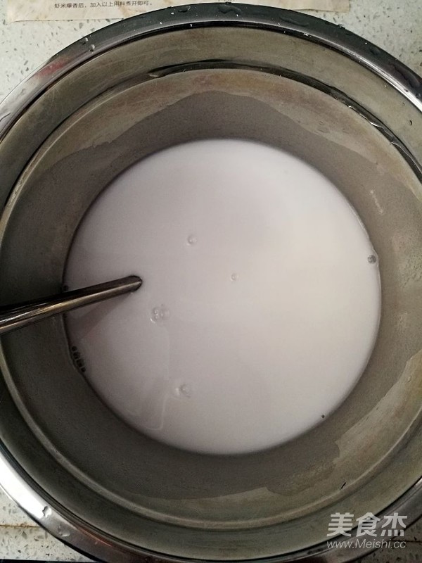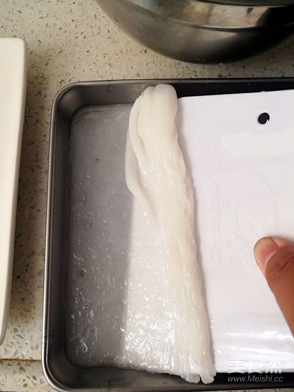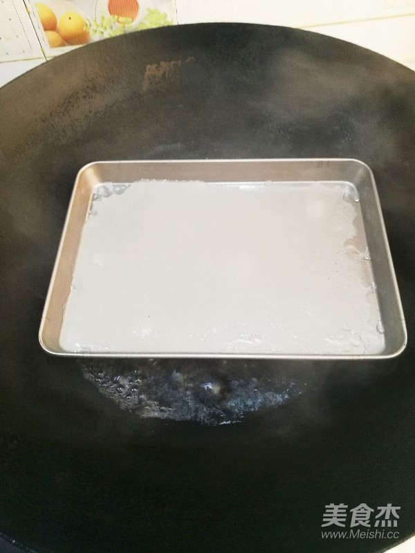 13.盛兩勺腸粉水到刷了油的托盤上,保證腸粉水能薄薄的鋪平在托盤里的量就行。每次盛之前要將腸粉水充分攪勻,因為靜置的腸粉水非常容易分層。