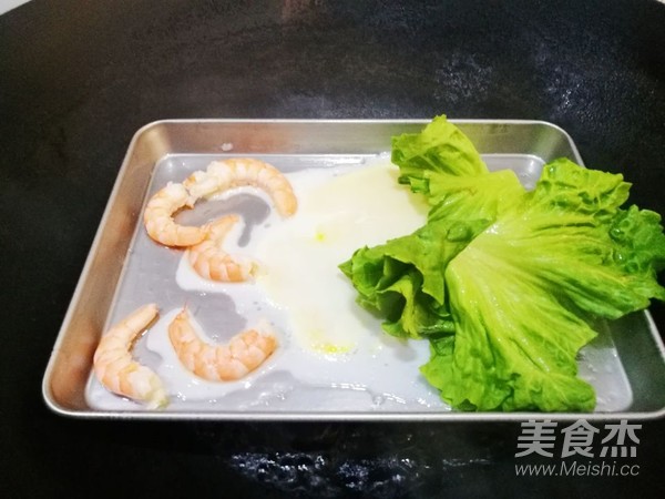 19.在托盤里刷上一層油,雞蛋和蝦仁放到托盤中,大火蒸熟,在放生菜。