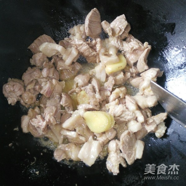鍋里放少許油燒熱,放入姜片,肉片翻炒