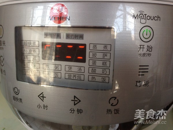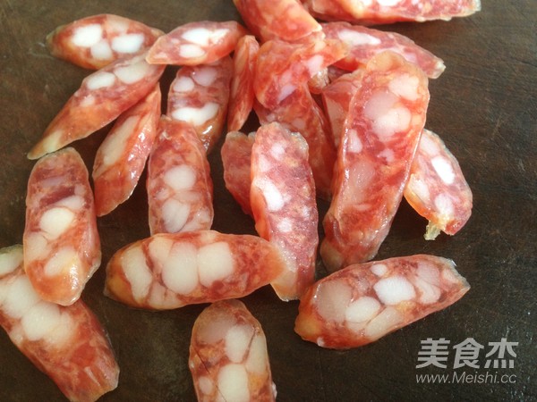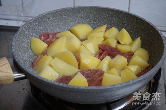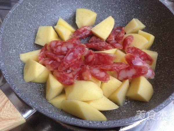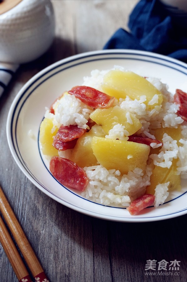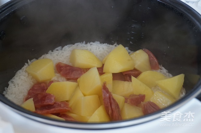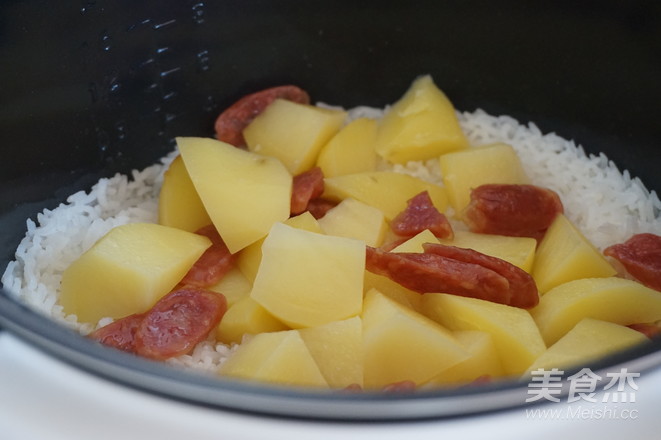 這時候米飯還剩20分鐘,將土豆臘腸倒在飯面上,立即蓋上鍋蓋