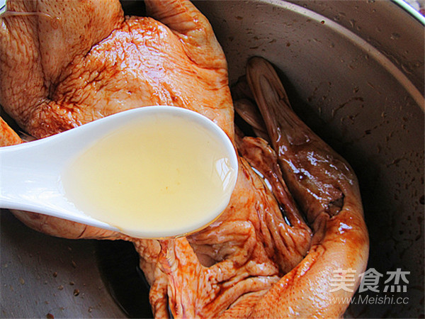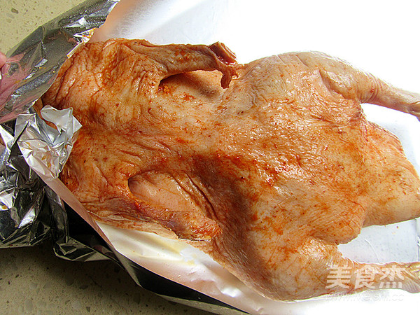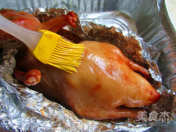 待表面的水稍稍瀝干后,放入預熱160度的烤箱,烤制1小時,注意先將整個鴨子用錫紙覆蓋著烤,烤制30分鐘左右取下錫紙接著烤