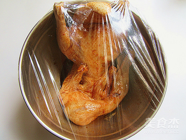 加入八角,花椒、冰糖、蔥段等塞進內臟,盆內加入清水,將這些調料拌勻,將鴨子腌漬在其中,裝鴨子的盆用保鮮膜包上,放冰箱腌漬冷藏一夜