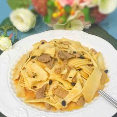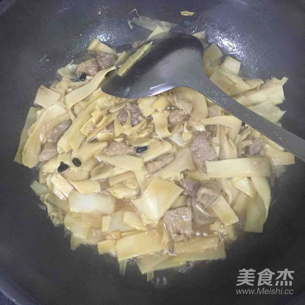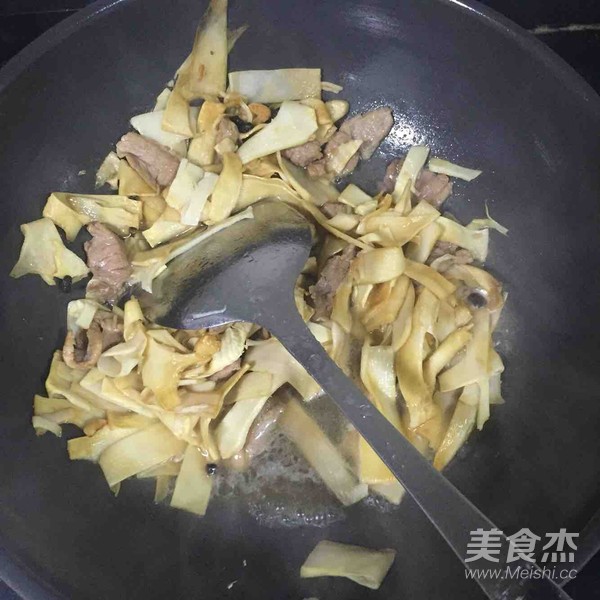下筍片,加入一勺醬油一勺鹽翻炒均勻。