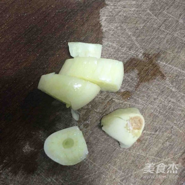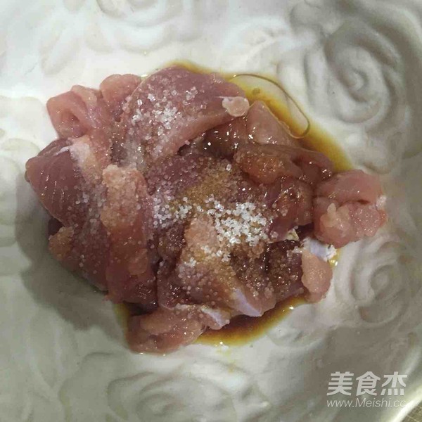 豬肉洗凈切片,放一勺醬油、一小勺鹽、少許糖、少許油腌制入味。