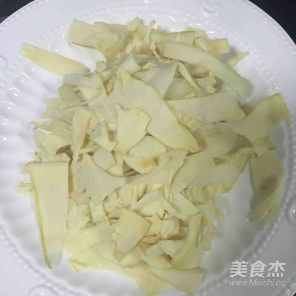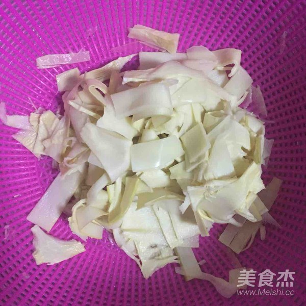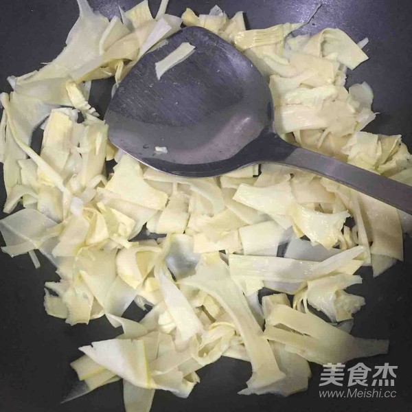 鍋內不放油,倒入筍片干炒三分鐘,烘干筍片里的水分,這樣炒的時候更入味。