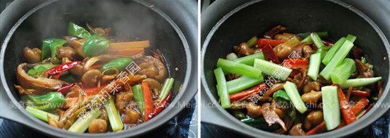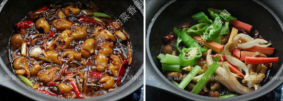13.燜至汁水收干,先放入柿子椒、胡蘿卜、芹菜等蔬菜