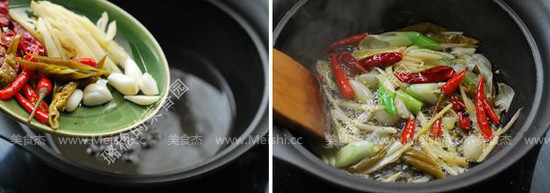 7.鍋中下油,冷油時丟10幾粒花椒進去,慢慢炒香,然后將蔥段、大蒜、生姜絲、干辣椒、泡姜絲、泡辣椒放入繼續煸炒