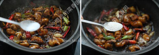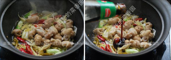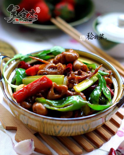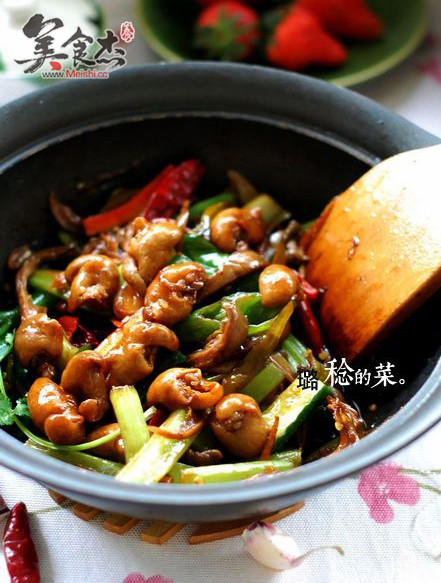 15.翻炒幾下,一點味精,關火,一盤色澤紅亮,滋味鮮香的干鍋肥腸就可以裝盤上桌了