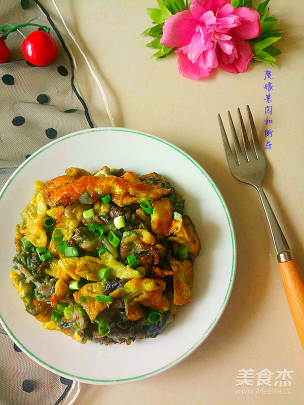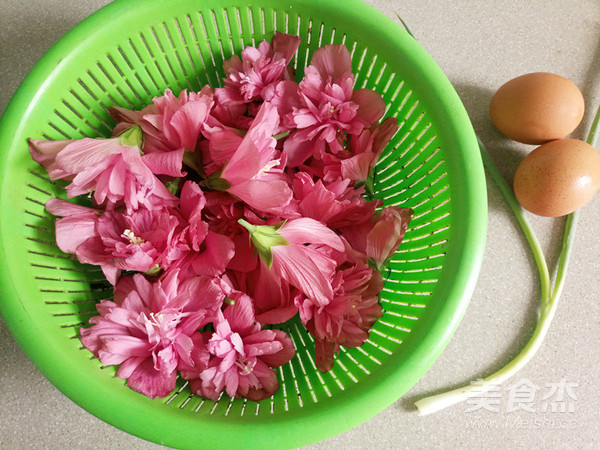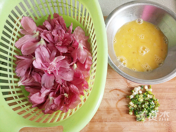 木槿花洗凈控水,雞蛋攪成雞蛋液,蔥切成蔥末。