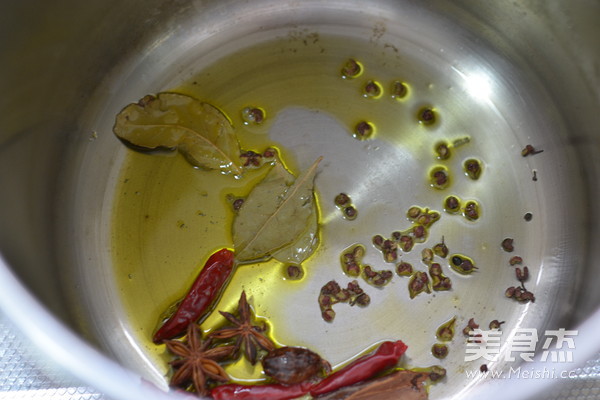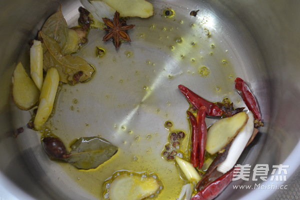 再下入蔥姜幾片炒出香味,不能和步驟6的香料一起放入,因?yàn)槭[姜成熟較快一起放入,如果掌握不好火力容易糊掉