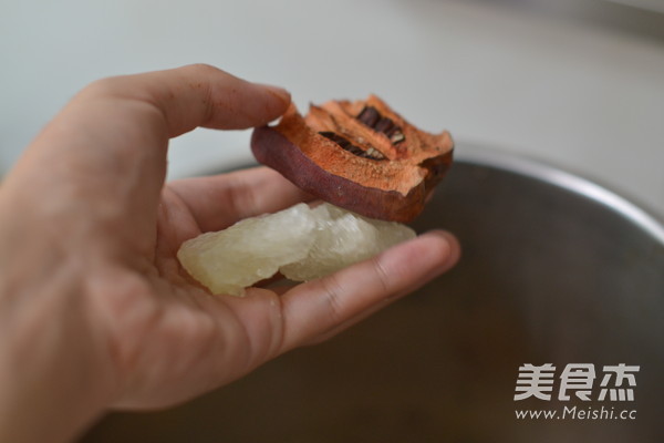 最后放入冰糖和干木瓜片,干木瓜片可不是水果木瓜曬干的,是一種青木瓜內(nèi)涵的酶可以使得肉質(zhì)軟爛、吃上去不過于油膩,跟檸檬山楂的作用是一樣的,如果沒有也可以不加或者放幾片檸檬、山楂