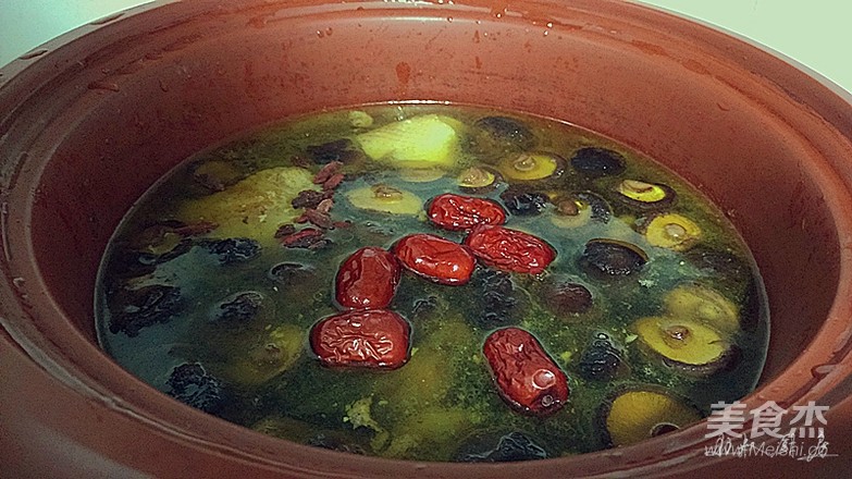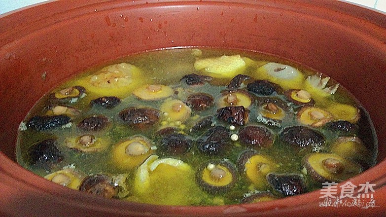 倒入燉鍋,放淘洗后擠干水份的香菇(泡發(fā)香菇的水同時(shí)倒入),放老姜顆、胡椒粒,燉兩小時(shí);
